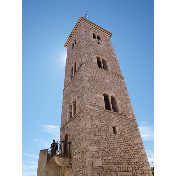 Southwest of the church there is a Romanesque bell tower, built as a separate building. Without the pyramid, it is 19.30 m high. The bell tower had four floors and on the first floor there is the entrance door and quite small atypical windows. On the other floors separated by profiled wreaths, there are Di-styles, one on each side. At the top there is a stone clock face dating to 17th century. Judging by the stylistic features, the construction of the tower dates to the 12th century....